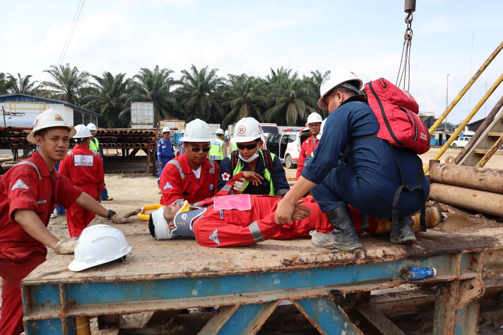 Part of Texcal Mahato EP FZCO HSSE Q1 2023 Programs, HSSE has conducted the “Level One Emergency Simulation” together with relevant stakeholders such as the Local Health Service (Puskesmas) and the Local Police (Polsek). This Level One Emergency Response Organization immediately is activated on Sunday, 19th March 2023. The event was triggered by a malfunction of the brake system to control the traveling block on a Drilling Rig while running job in the 3.5″ Drilling Pipe, thus affected 4 Floormen, 1 Rigger, 1 Driller and involving 1 Directional Driller from a service company on the Rig Floor. The Drilling Rig Superintendent had reported this incident to HSSE Department. HSSE Department and OSC (On Scene Commander) immediately activated the Emergency Response Team as part of Emergency Organization.