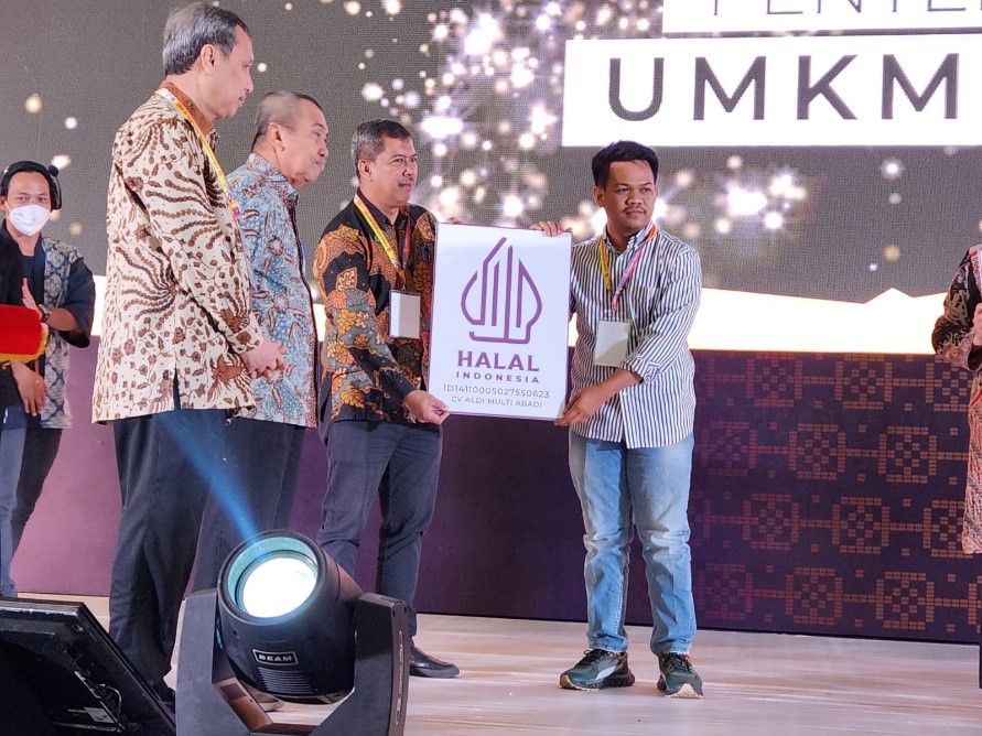 The new Halal certificate issued by Badan Penyelenggara Jaminan Produk Halal (BPJPH) and has been endorsed by Majelis Ulama Indonesia (MUI) is replacing the old halal certificate issued by MUI for all products mostly consumer goods or F&B products. The process to be halal certified also subject to be audited by Sucofindo and very time-consuming since the auditors need to visit the factory/ workshop where the products made. There were more than 5 (five) UMKMs proposed by various KKKS to be Halal certified in the Batam’s National Capacity Forum, however, only 4 (four) UMKMs finally succeeded in obtaining the Halal certificates and 2 (two) of them are CV. Aldi Multi Abadi and Ulie Oleh-Oleh Kampar under TEMI’s. The ceremony in handing over the halal certificates to the respected UMKMs was held during the gala dinner session at Radisson Hotel, Batam, on July 13, 2023, which were attended by the Governor of Riau Province, Mr. Syamsuar, and Deputy of SKK Migas, Mr. Rudi Satwiko.